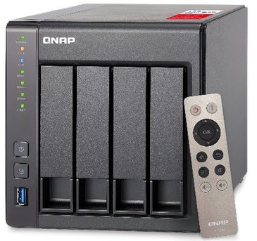 QNAP 4-Bay NAS, Intel Celeron Quad-Core 2.0GHz (up to 2.42GHz), 2GB DDR3L RAM (max 8GB), SATA 6Gb/s, 2 x GbE, hardware transcoding, HDMI out with kodi, remote control included, Virtualization Station, Surveillance Station (max 40 Ch), max 1 UX-800P/500P expansion unit