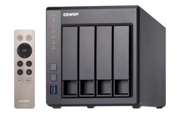 QNAP 4-Bay NAS, Intel Celeron Quad-Core 2.0GHz (up to 2.42GHz), 8GB DDR3L RAM (max 8GB), SATA 6Gb/s, 2 x GbE, hardware transcoding, HDMI out with kodi, remote control included, Virtualization Station, Surveillance Station (max 40 Ch), max 1 UX-800P/500P expansion unit